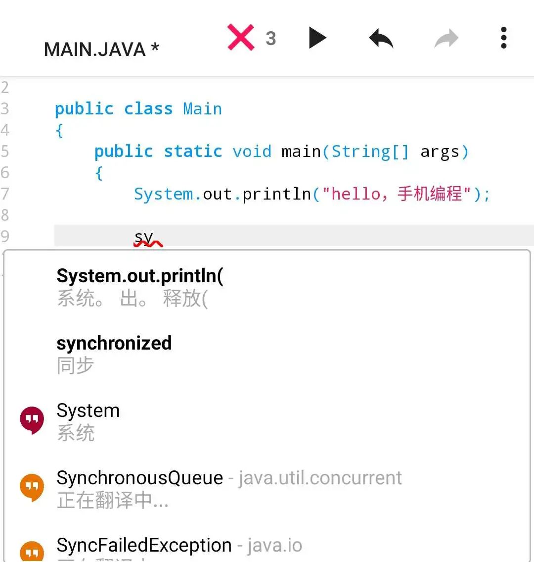 可以看到,舞剑在 AIDE 中只键入 sy 两个单词,下方就已经出现了 System.out.println, synchronized 等系统自带方法,根本无须苦苦记忆繁琐的 Java 方法与变量名。