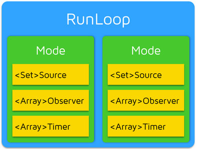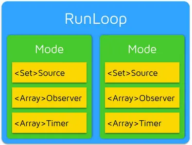 一个 RunLoop 包含若干个 Mode,每个 Mode 又包含若干个 Source/Timer/Observer。每次调用 RunLoop 的主函数时,只能指定其中一个 Mode,这个Mode被称作 CurrentMode。如果需要切换 Mode,只能退出 Loop,再重新指定一个 Mode 进入。这样做主要是为了分隔开不同组的 Source/Timer/Observer,让其互不影响。