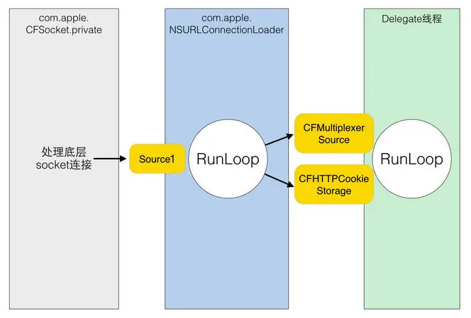 NSURLConnectionLoader 中的 RunLoop 通过一些基于 mach port 的 Source 接收来自底层 CFSocket 的通知。当收到通知后,其会在合适的时机向 CFMultiplexerSource 等 Source0 发送通知,同时唤醒 Delegate 线程的 RunLoop 来让其处理这些通知。CFMultiplexerSource 会在 Delegate 线程的 RunLoop 对 Delegate 执行实际的回调。