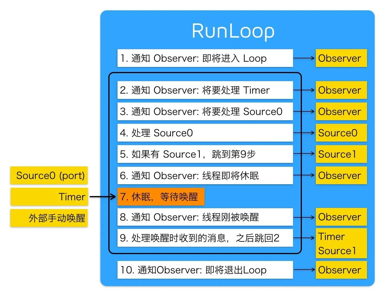 是观察者,每个 Observer 都包含了一个回调(函数指针),当 RunLoop 的状态发生变化时,观察者就能通过回调接受到这个变化。可以观测的时间点有以下几个: