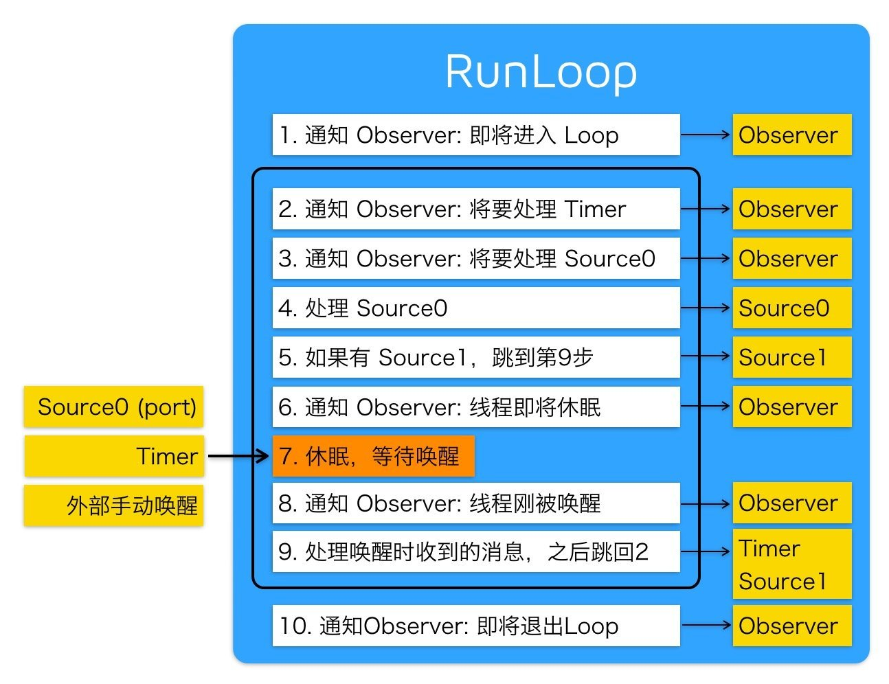 所以,RunLoop 实际上就是一个对象,这个对象管理了其需要处理的事件和消息,并提供了一个入口函数来执行上面 Event Loop 的逻辑。线程执行了这个函数后,就会一直处于这个函数内部 “接受消息->等待->处理” 的循环中,直到这个循环结束(比如传入 quit 的消息),函数返回。