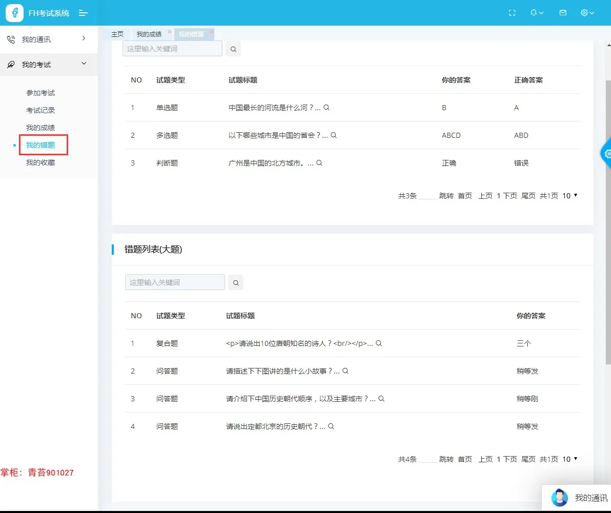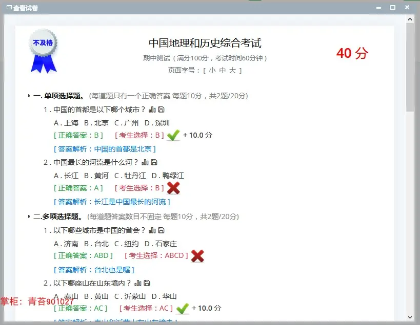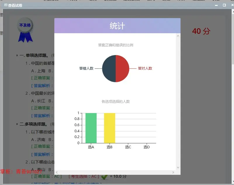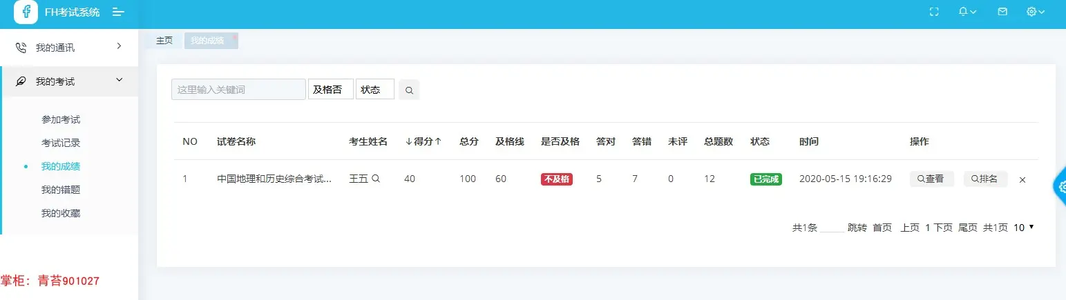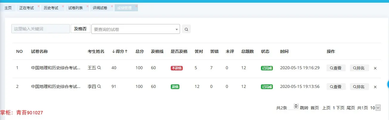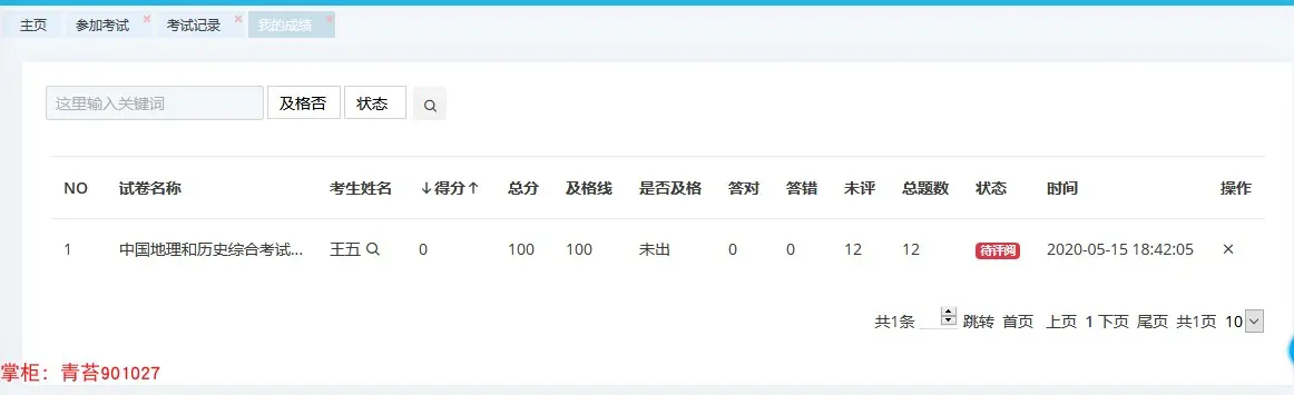 37. 我的成绩:查看自己的成绩,需要人工评阅的待评阅后才可看到成绩,已出的可以查看试卷信息,统计等