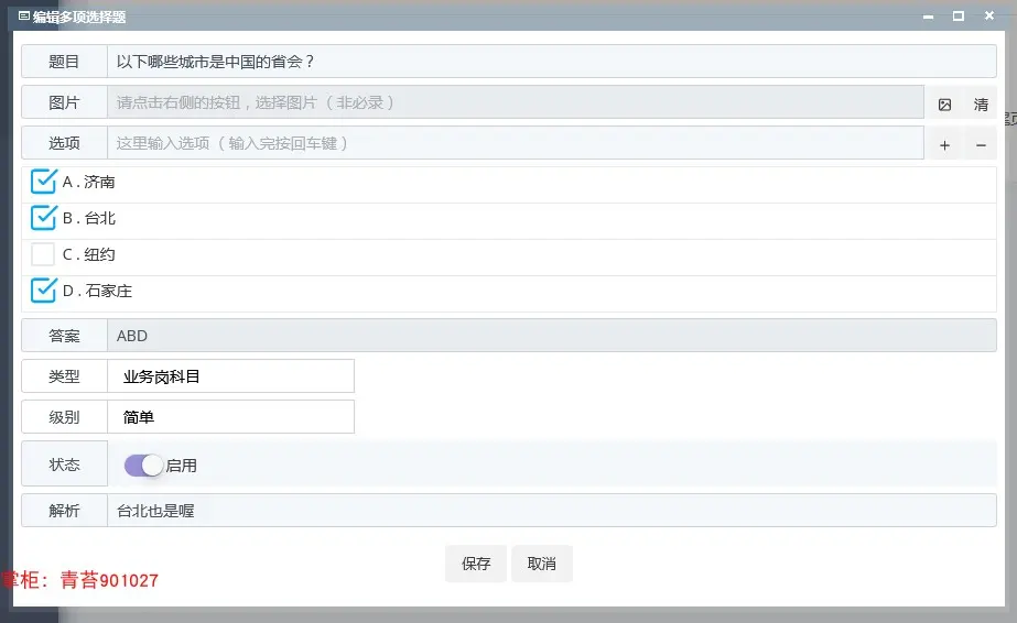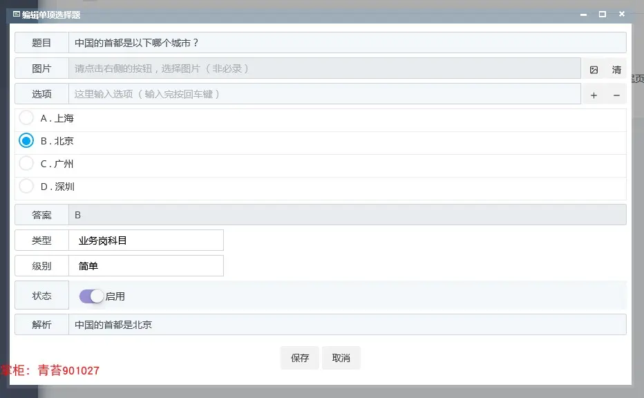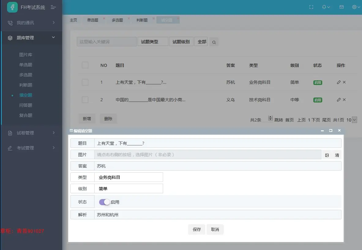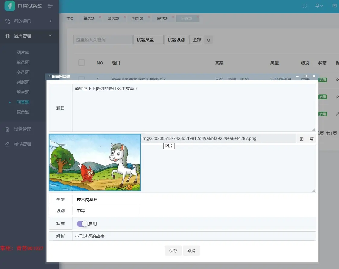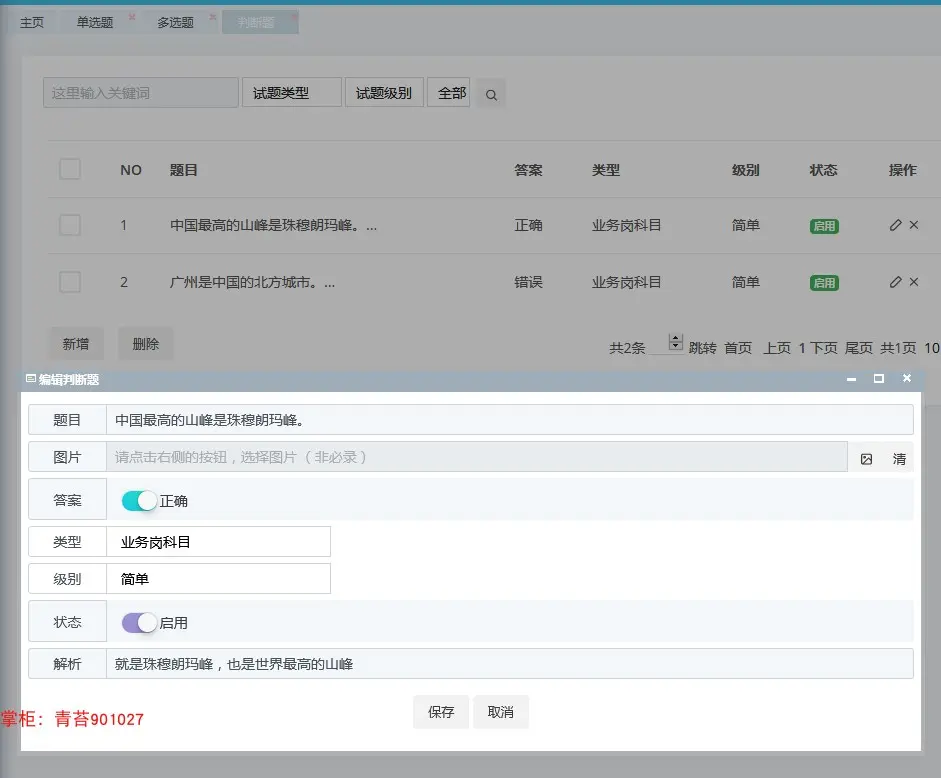 27. 问答题:维护问答试题,试题题目,答案,类型,级别,状态,解析