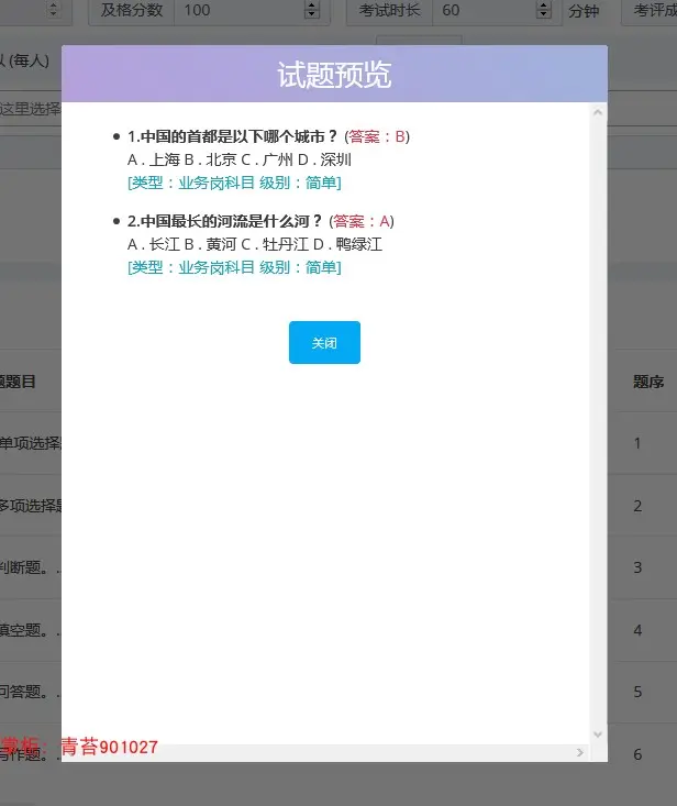 试卷题型:试卷明细,给试卷添加题型,分值,随机或者手动从题库选择试题,预览试题,自动合计试卷总分