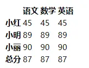 <table> <thead> <tr> <th></th> <th>语文</th> <th>数学</th> <th>英语</th> </tr> </thead> <tbody> <tr> <th>小红</th> <td>45</td> <td>45</td> <td>45</td> </tr> <tr> <th>小明</th> <td>89</td> <td>89</td> <td>89</td> </tr> <tr> <th>小丽</th> <td>90</td> <td>90</td> <td>90</td> </tr> </tbody> <tfoot> <th>总分</th> <td>87</td> <td>87</td> <td>87</td> </tfoot> </table>效果: