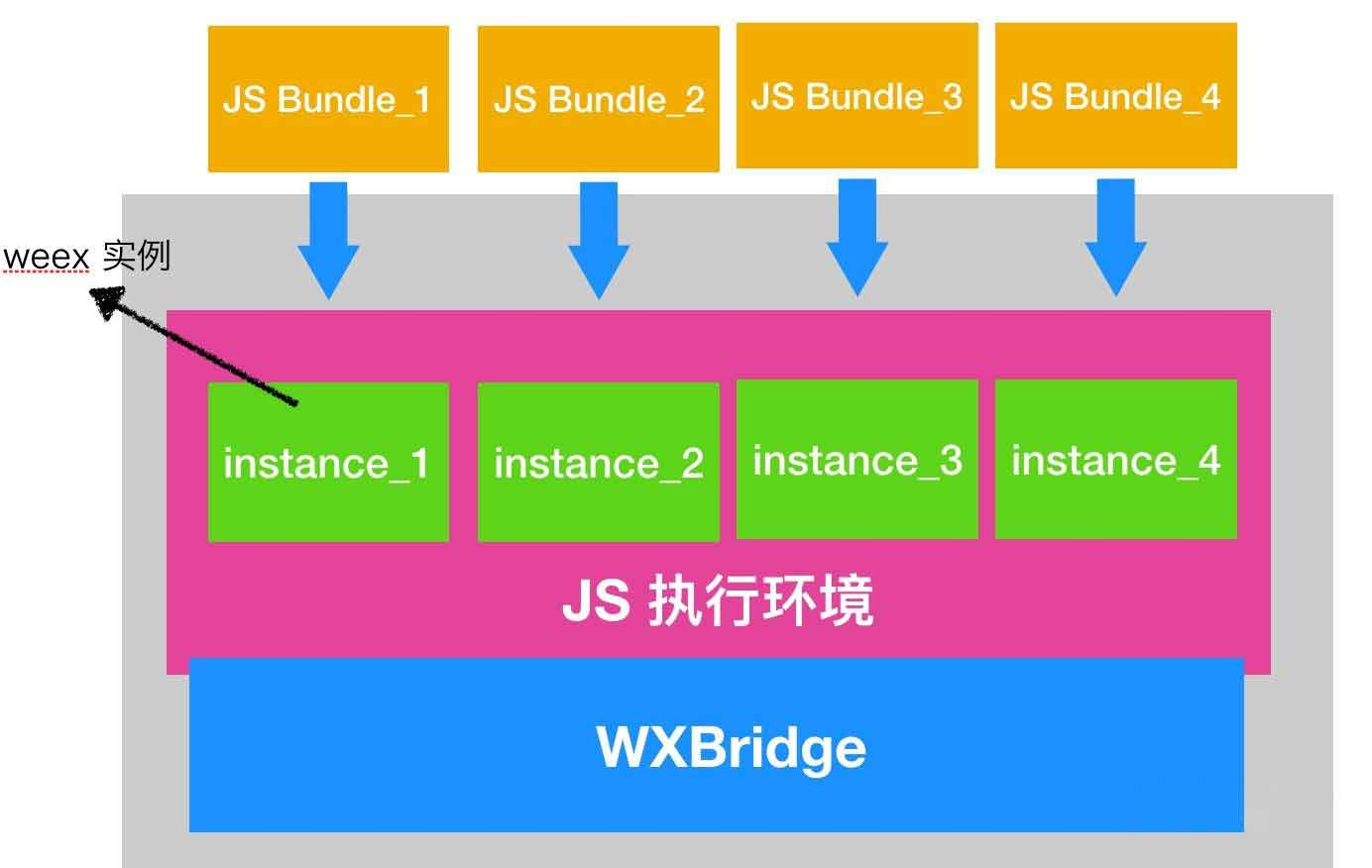 由于所有的js bundle都是放入到同一个JS执行引擎中执行,那么当js执行引擎通过WXBridge将相关渲染指令传出的时候,需要通过instance id才能知道该指定要传递给哪个weex实例。