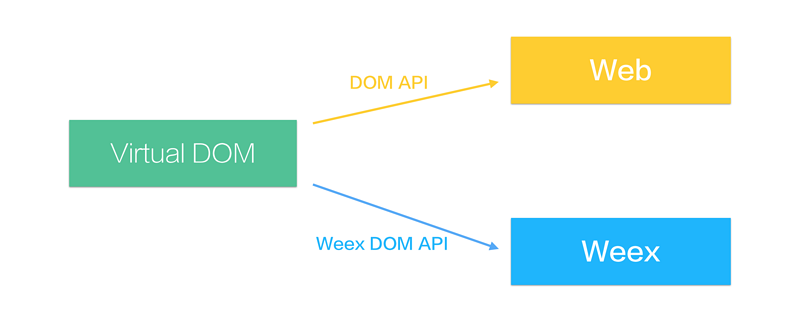 在浏览器上它们都使用一致的 DOM API 把 Virtual DOM 转换成真实的 HTMLElement。在 Weex 里的逻辑也是类似的,只是在最后一步生成真实元素的过程中,不使用原生 DOM API,而是使用 JS Framework 里定义的一套 Weex DOM API 将操作转化成渲染指令发给客户端。
