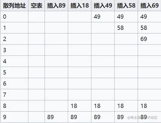 第一次冲突发生在填装49的时候。地址为9的单元已经填装了89这个关键字,所以继续向后查找空位置,发现下一位为空,所以将49填装在地址为0的空单元。第二次冲突则发生在58上,往下查找3个单位,将58填装在地址为1的空单元。69同理。