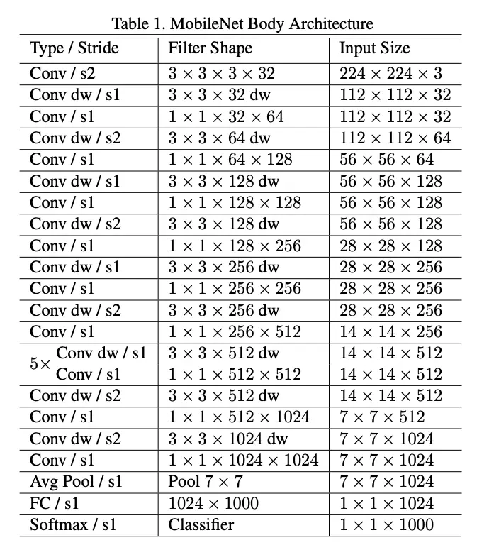 MobileNet的结构如表1所示,除第一层外其它均是深度可分离卷积,除了最后一层全连接层外每层都接BN和ReLU,总共28层。