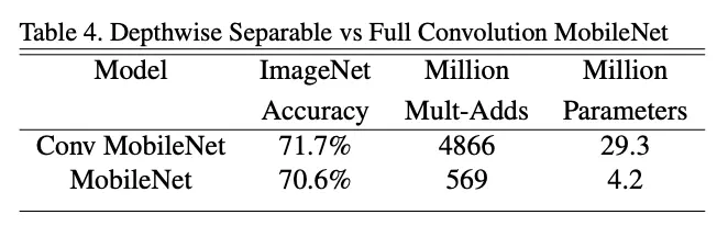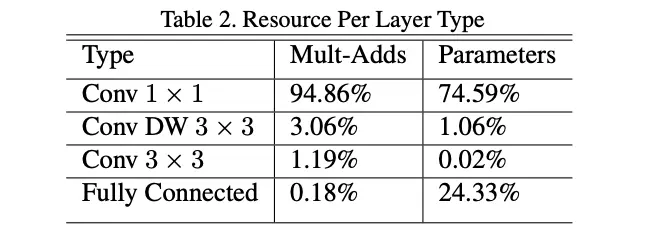 论文提到不能直接通过计算量来代表网络的高效性,还需要看操作的具体实现方法。如表2所示,MobileNet的大部分计算量和参数都在pointwise卷积上,不管在CPU设备还是GPU设备,都已经有很高效的实现方法。至于训练的设置,论文也有较详细的提及,有兴趣的可以去看看原文。