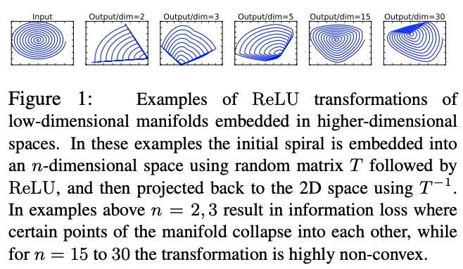 恢复至2维。从可视化结果来看,维度越低,ReLU对输入的信息丢失越多。这表明,假设非线性操作的输入特征能够压缩成较低维特征时,需要输入特征有足够大的复杂度,非线性操作才能保留较完整的信息。