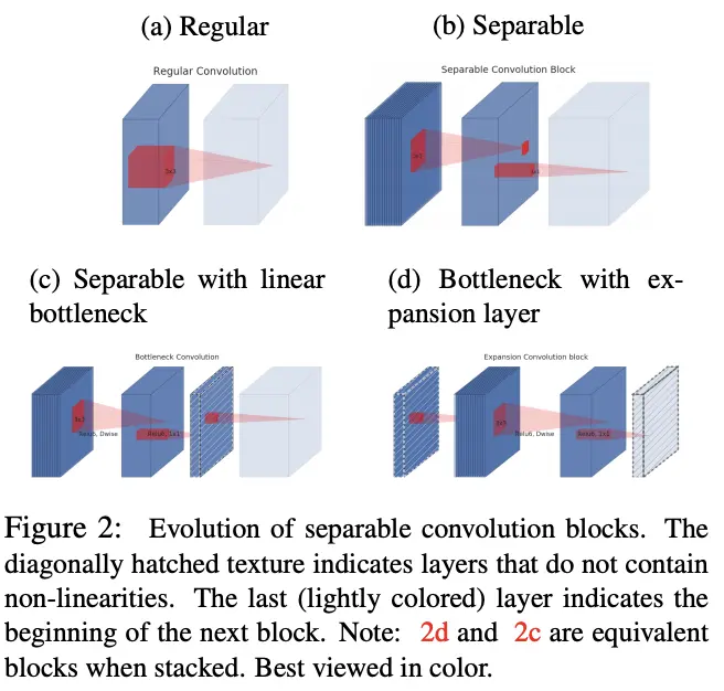 假设层输出的关键信息可以通过低维特征进行表示,则可以使用线性bootleneck进行提取,结构如图2c所示,在深度卷积后接pointwise卷积进行降维,但在降维后不再使用非线性激活,仅对高维特征进行非线性激活。而图2d是结构c的前一部分,两者合起来构成一个完整的MobileNetV2 bottleneck,先通过pointwise卷积升维,然后深度卷积提取特征,最后再使用pointwise卷积进行降维,其中升维的比例称为expansion ratio。