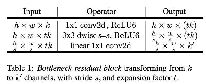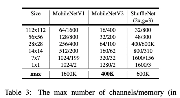 residual block的操作以及输入输出如表1所示,尽管相对于MobileNetV1多了一个pointwise卷积,但这样的结构允许更少的输入输出维度。从表3的对比可以看出,MobileNetV2的内存使用更少。而expansion ratio的设置可以允许结构有很多种变化,设为0时就是identity mapping,设为大于1则是Resnet的residual block。