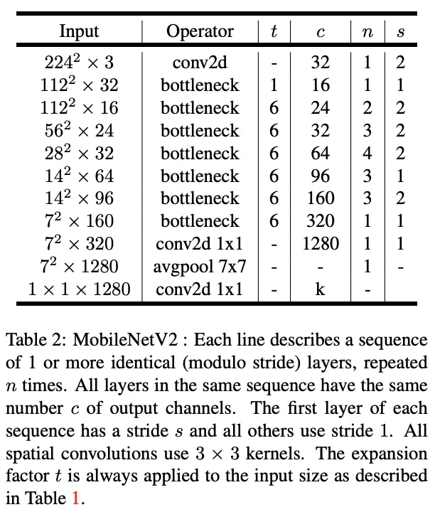 MobileNetV2的整体结构如表2所示,通过堆叠图4d的结构进行构建,首层使用普通的卷积层,另外也可以通过宽度缩放因子和分辨率缩放因子来进行准确率和时延之间的trade off。