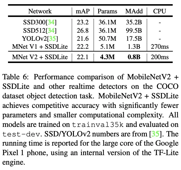 论文对比MobileNetV2与其它网络在目标检测上的性能。