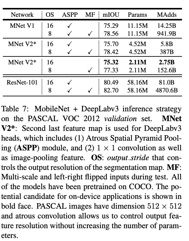 论文对比MobileNetV2与其它网络在语义分割上的性能。