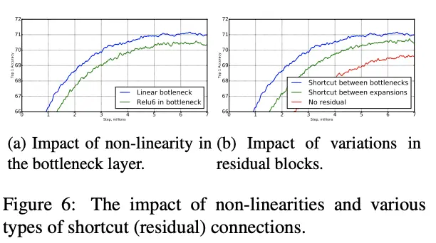 另外论文对inverted residual with linear bottleneck的改进进行验证。