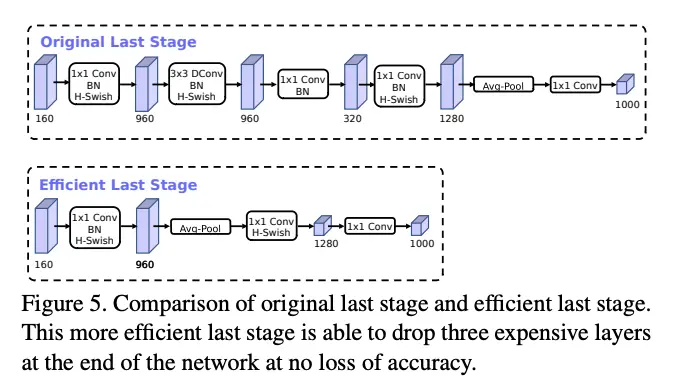 的卷积,论文认为这些卷积里面存在冗余,通过实验,将维度降维16维不影响准确率,带来2毫秒的速度提升,非线性激活使用了论文提出的hwish非线性激活,效果与其它函数差别不大。