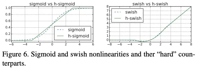 由于swish包含了sigmoid函数,在移动设备上计算没有很好地优化。因此,论文将sigmoid替换成分段线性模拟,提出了改进版hwish:
