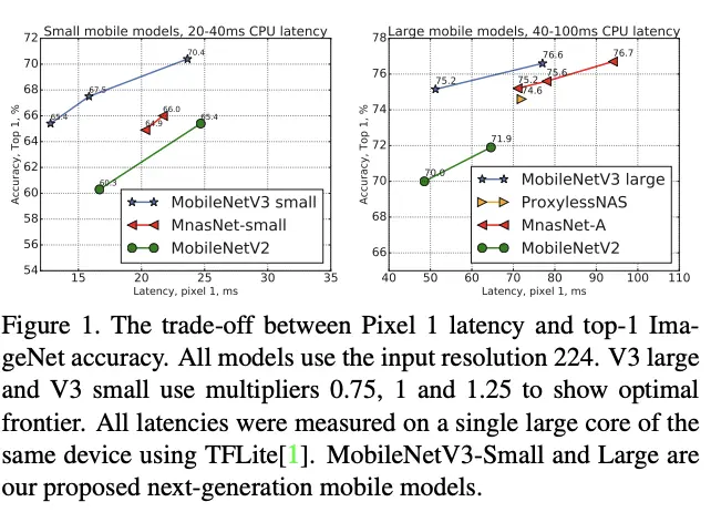 MobileNetV3首先使用MnasNet的platform-aware NAS进行每个block的层结构搜索,再将搜索结果按照预设的网络结构搭建起来,有兴趣的可以去看看公众号的讲解。platform-aware NAS主要是以准确率和实际时延的加权作为优化指标,逼近帕累托最优(准确率和时延分别不能再同时增加)。论文在实践时发现,对于小模型而言,时延的增加会导致精度急剧增大,因此需要增大
