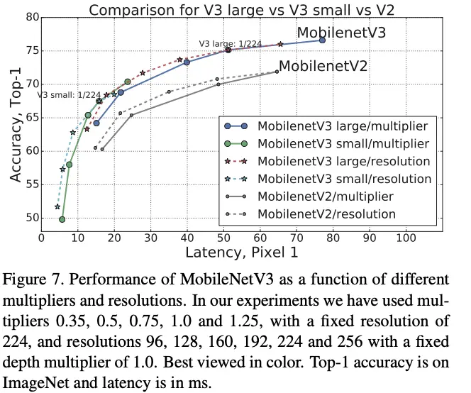 论文对比MobileNetV3与其它网络在图像分类上的性能。