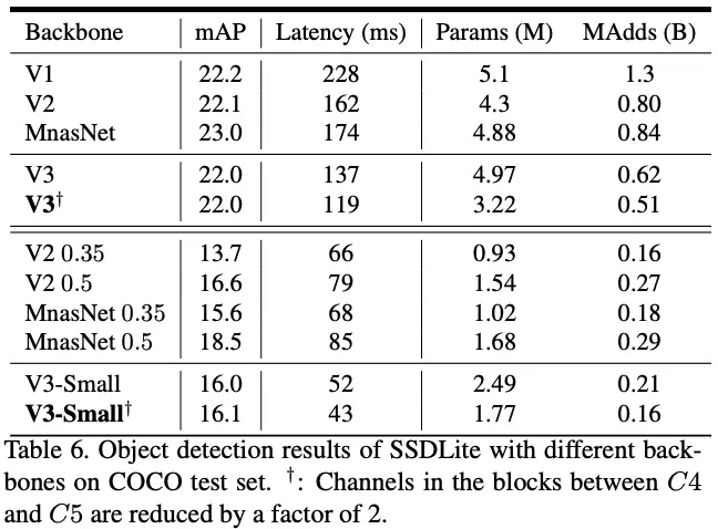 论文对比MobileNetV3与其它网络在目标检测上的性能。