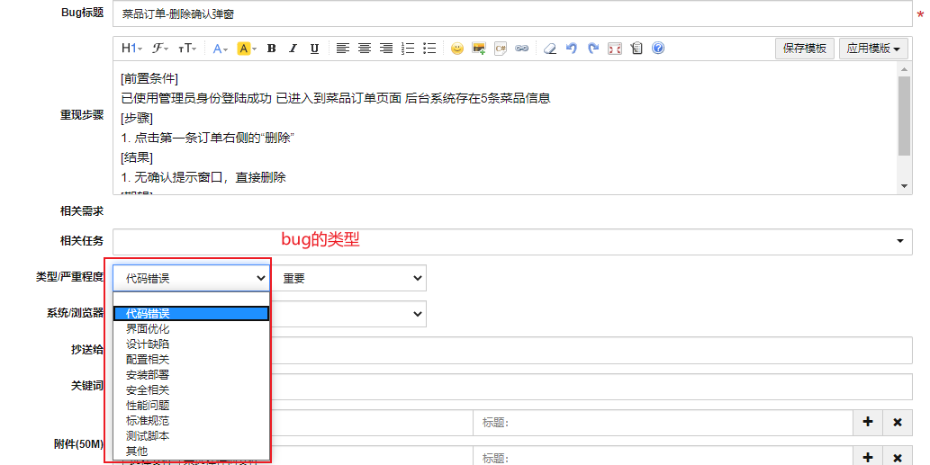 - 标题:简明扼要地描述Bug,可以让负责修复的人员快速了解,定位问题