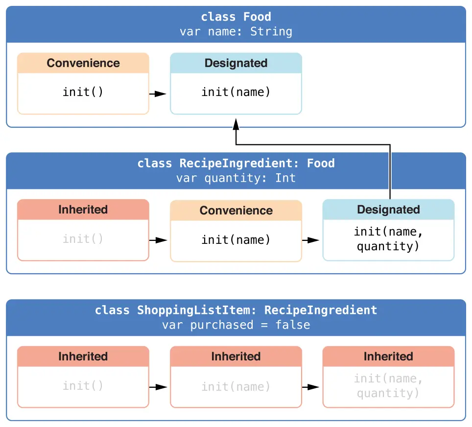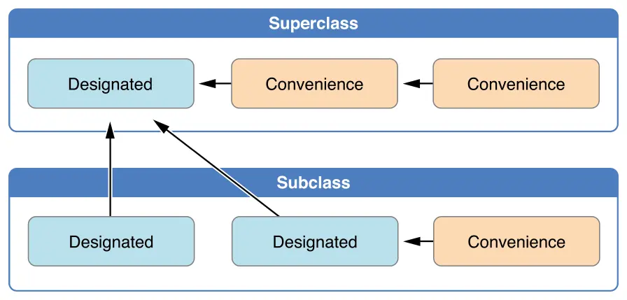 您还必须在所需的初始化方法的每个子类实现之前编写required修饰符,以指示初始化方法要求适用于链中的其他子类。 重写必需的指定初始值设定项时,您无需编写override修饰符: