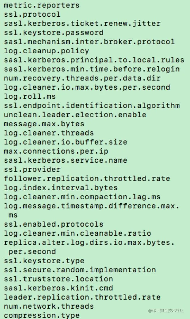 我们一起来看一张图片,它展示的是我的一个 Kafka 集群环境上的动态 Broker 端参数。