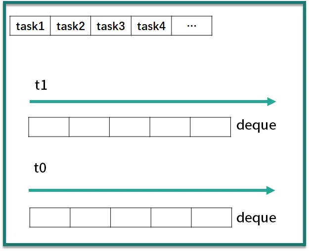 它跟普通线程池还有个不同的地方就是队列,普通线程池只有一个队列,而它除了用于保存提交任务的队列之外,每个线程都有自己独立的任务队列,用于存储fork之后的任务