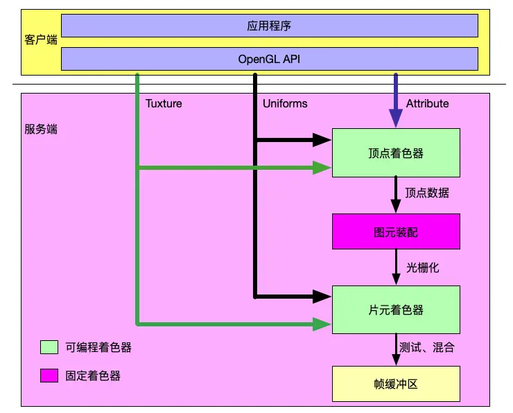 从上图可以看到,服务端可以从客户端获取三种类的数据:Attribute、Uniforms和 Tuxture。下面就这三种数据做一个简要的说明。