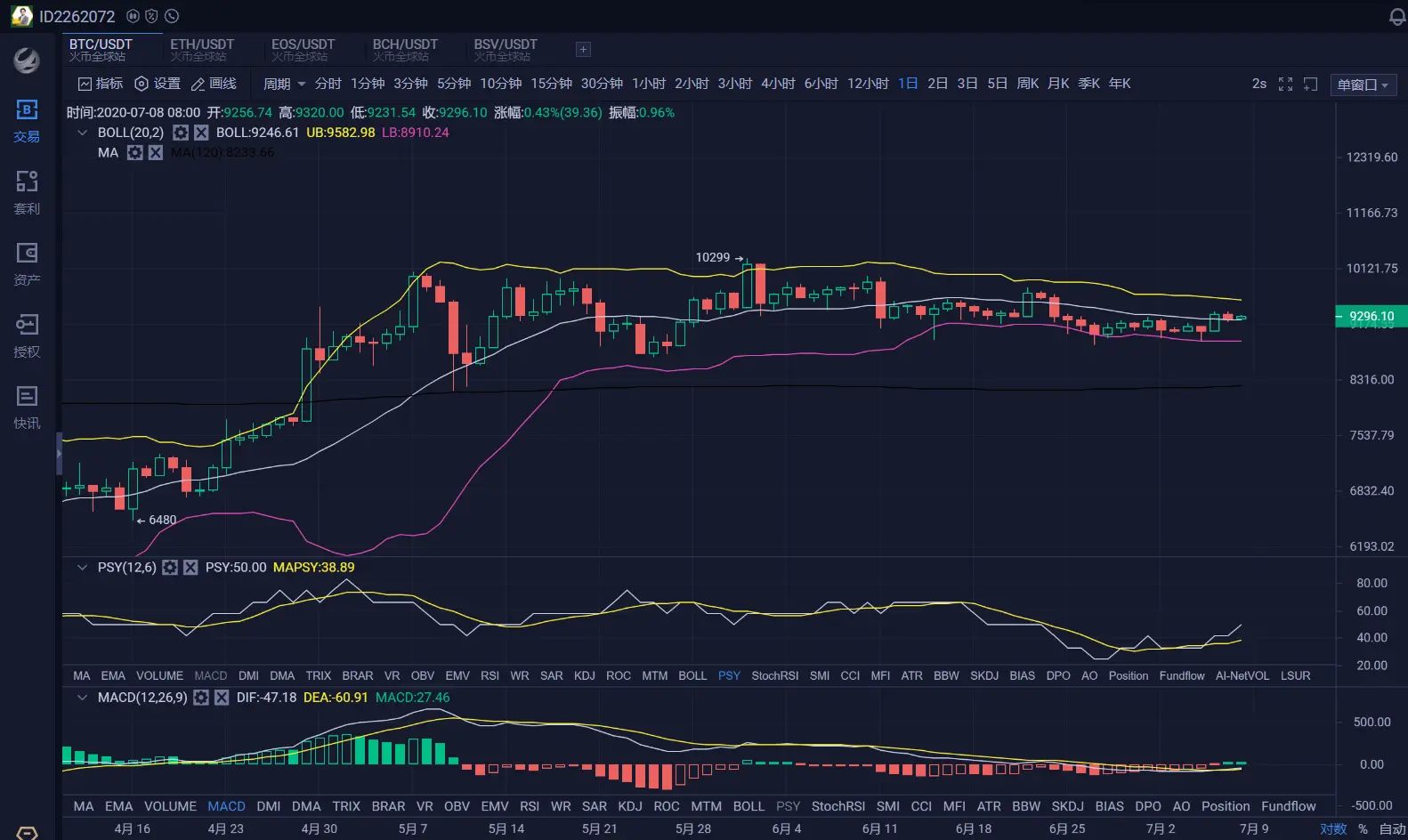 行情回顾: 昨日以一根阴线收尾,最高币价在9377一线,持续在上方压力位一带盘旋,午间的时候开始震荡下行,最低点位在9210附近,晚间进入了震荡9240-9280区间,目前盘面已经进入了反弹行情,现在币价在9288附近位置.