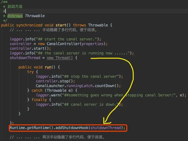只要有这个钩子函数,对外就提供了扩展能力,研发人员就可以往钩子上挂各种自定义的场景实现,这种设计你细品那绝对是香!这也就是 Canal、Flume、Tomcat 等不同应用,在优雅停服时有着不同的实现的原因吧。