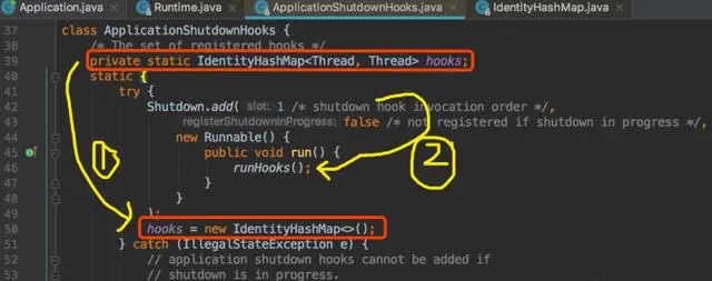 如上图 Runtime 的源码所示,遵循 Java 的核心思想「一切皆是对象」,那么可以把 addShutdownHook 方法可以视作挂钩子,其实称之为钩子函数会好一些,而现实生活中的肉就可以抽象为释放资源的线程。