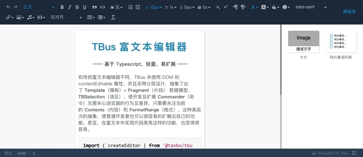 在经历了一年时间,两个大的架构设计变动下,至今,TBus 富文本编辑器的基础设计基本稳定。我决定将 TBus 富文本编辑器开源,在各路大神的锐利的目光下,能走得更远。