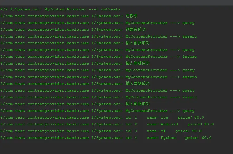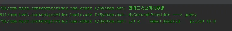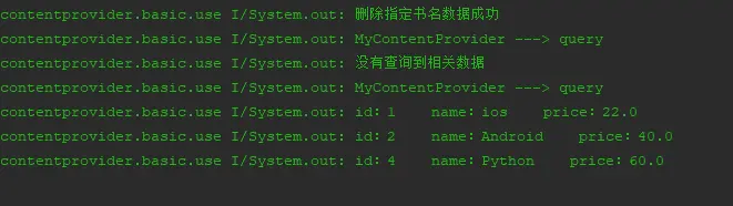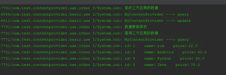 从图中打印输出程序的包名看出,我们查询到了主应用的所有数据成功,之前我们删除了c#这条记录,所以查询到的结果和之前是一样的。在所有操作之前,我们先要通过getContentResolver()方法获取到ContentResolver对象,因为之前也说过对ContentProvider的所有操作都需要通过ContentResolver对象来完成,下面的新增、修改、删除操作也是一样。 在输入框中输入Android单独查询,得到以下输出。可以看到也是查询成功了 - 新增数据。新增操作和主应用一样,直接在输入框中输入java以及价格70,点击插入按钮之后,我们再次点击查询按钮查询所有的数据,得到以下输出。可以看到数据成功插入。