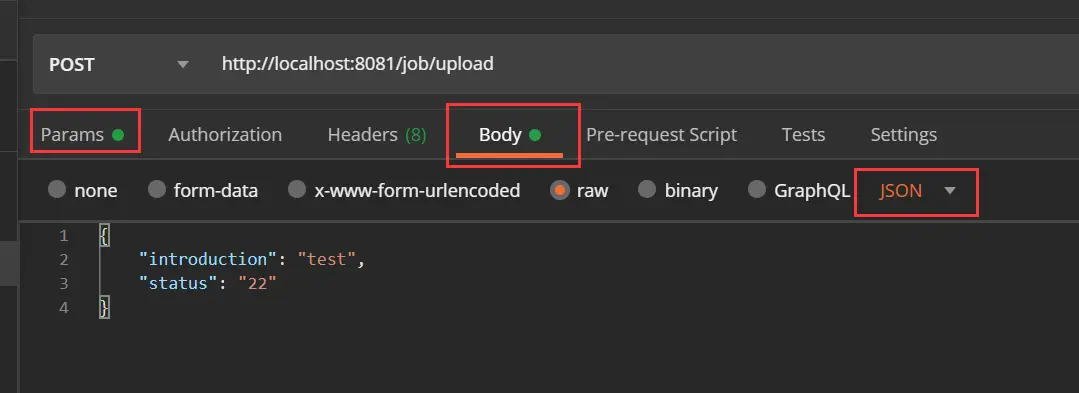 如果是在Postman中进行测试,需要将json数据写在Body中,且设置类型为Json,而不是将参数放在Params中,如图: