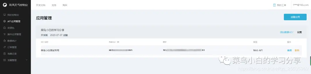 前面的调用百度AI开放平台的API进行动漫照片处理时一直都有同学反馈API该如何获取,那这一次菜鸟小白就学聪明了,直接给出API的获取方式,机智如我,哈哈~~ 和风天气网址:console.heweather.com 首先我们需要注册一个和风天气的账号,然后新建一个应用