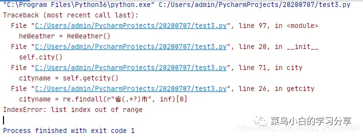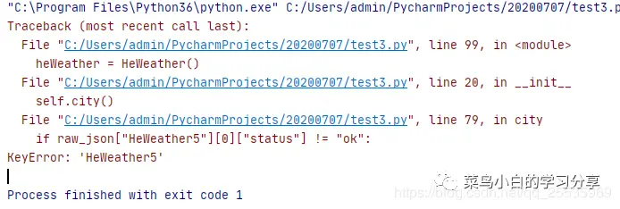 果然,打印出来一看这也完全匹配不上啊,而且里面根本就没有我们需要的城市信息啊,那算了吧,我们不要获取城市信息了,直接返回菜鸟小白所在的城市名称——合肥算了。 OK,改过之后这一个算是先过去了,再次执行后又出错了