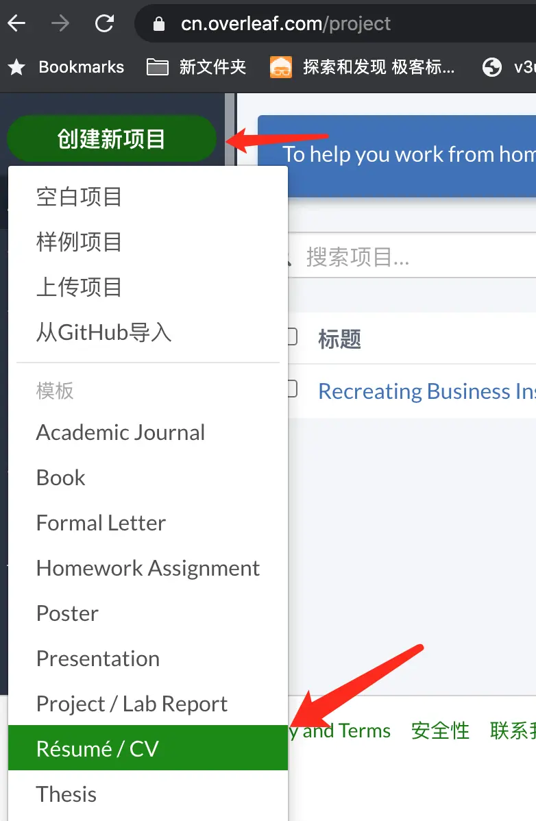 通过邮件激活后,选择新建项目,并且点选简历这一项