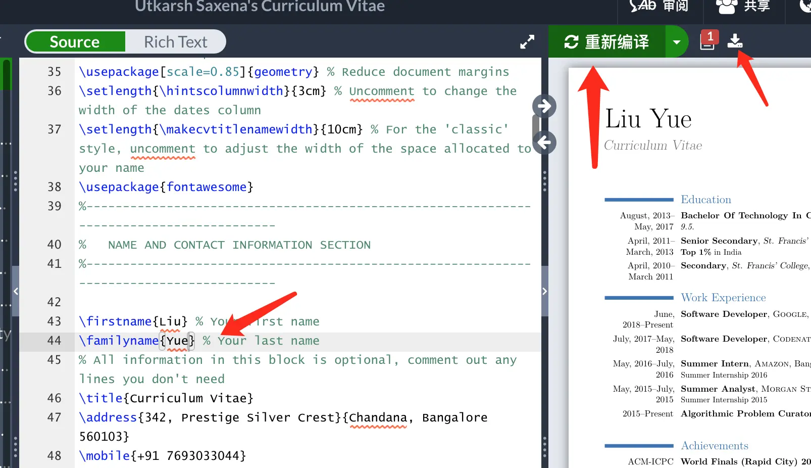 编辑之后,可以点击重新编译查看效果,如果编辑好之后就可以在线下载pdf,非常方便