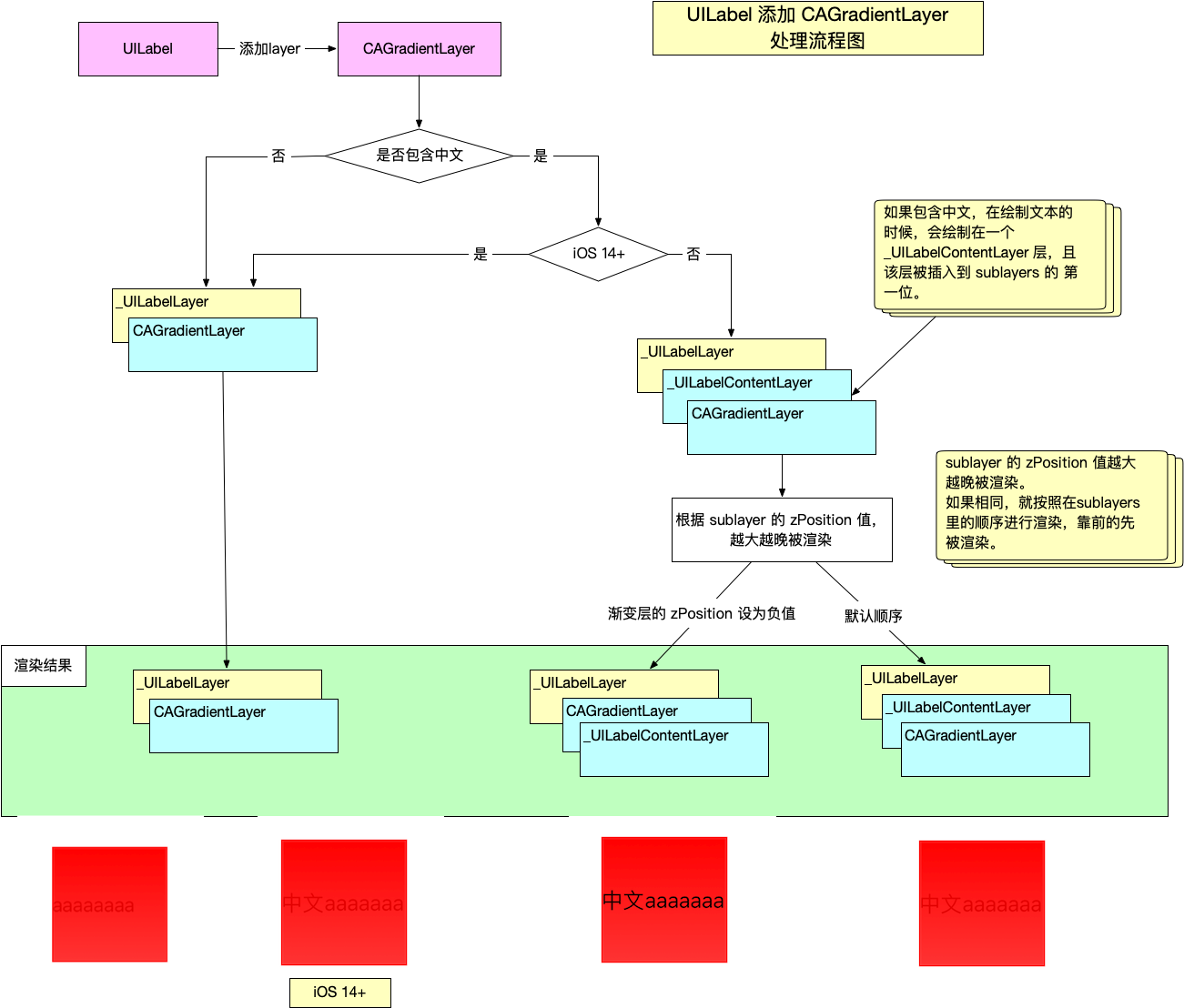 在 iOS14+,苹果做了优化,即便文本包含中文,也不会添加 _UILabelContentLayer 层,直接绘制在 _UILabelLayer 层。因此,再也不能实现一个 CAGradientLayer 作为背景了。