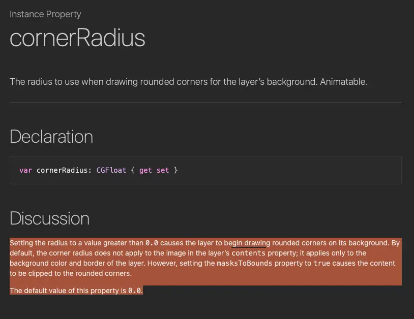 首先理解一下图层叠加的算法油画算法就是先画远的物体然后再画近的物体由远及近 再来看一下CALayer的层次结构,CALayer由背景色backgroundColor、内容contents、边缘borderWidth&borderColor构成,如下图所示 然后再看一下官方API关于圆角的解释 就是说圆角只会对背景色和边框起作用,并不会对contents起作用,所以要想对contents也做圆角处理那么需要将圆角意外的东西裁减掉就是clipsToBounds/masksToBounds设置为true。