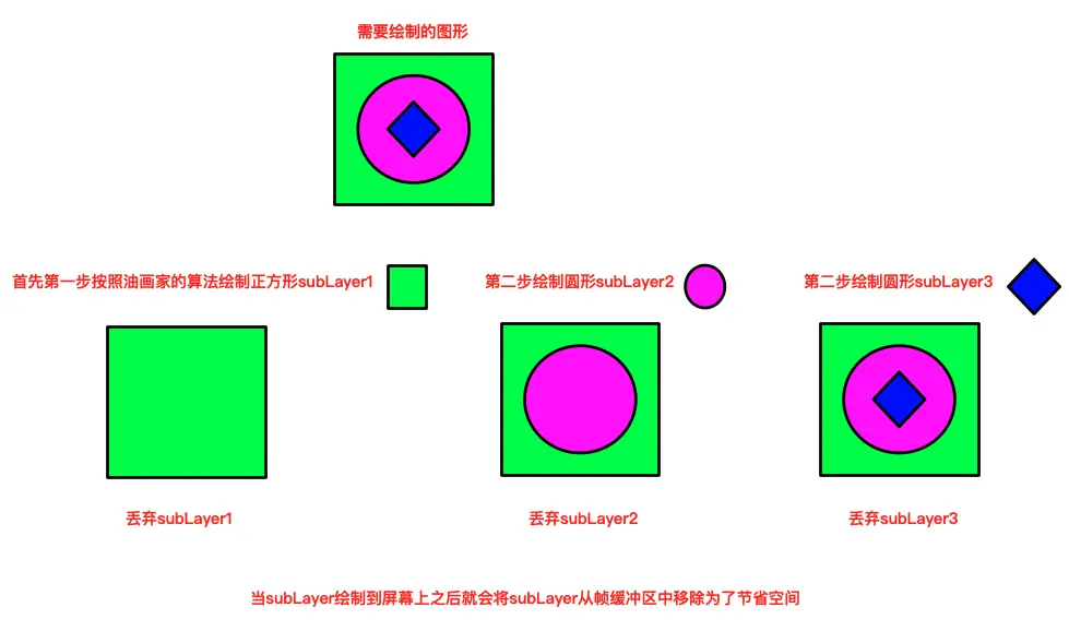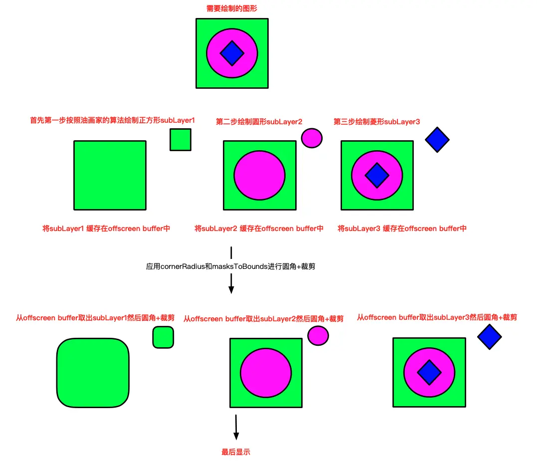接下来看一下正常绘制的一个过程: 可以发现每次绘制并显示完成之后会将对应的subLayer移除,就没办法进行圆角处理,所以引入离屏缓冲区先图层绘制存放到离屏缓冲区,都绘制完成之后再一个一个拿出来裁剪混合存储到帧缓冲区最后显示: 说白了就是牵扯到给contents做圆角并且还有混合过程的情况就会出现离屏渲染,例如只设置UIImageView的image不加背景色设置圆角并且裁剪并不会出发离屏渲染,但是要设置背景色就牵扯到两个以上图层的混合(应为裁剪是在所有图层绘制完成之后才对每个图形进行裁剪,所以就要将所有图层显存放到离屏缓冲区中然后一个一个提取裁剪最后混合显示)所以就要利用到离屏缓冲区,所以就会触发离屏渲染