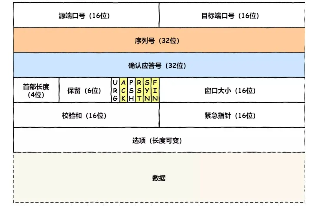 - 客户端向服务器发送一串TCP报文,那么我们先介绍一下一串TCP报文中主要有哪些东西(参考大佬博客的图):那我们再看三次握手的图,是不是就很清晰了,第一次握手发送的seq就是32位序列号,在我们截获下来的数据包中就是3746534935这串数字,而SYN就是报文中的SYN位置对应的数据。所以第一次握手发送的是SYN=1(这是默认的),同时也把序列号(seq)的信息也发过去了。