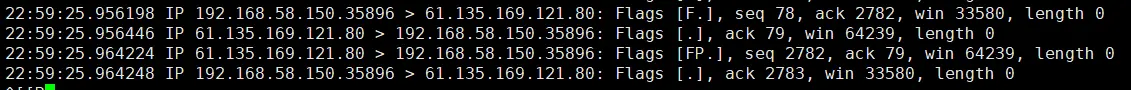 我们看到百度已经给我们返回HTML的页面了(有linux不能上网的同学自行解决),所以我们回过头来看之前监听的信息,发现给我们打印了11行信息,前三行是和建立连接有关的,中间四行是和传输数据有关的,后四行是和断开连接有关的,所以我们先来看前三行: