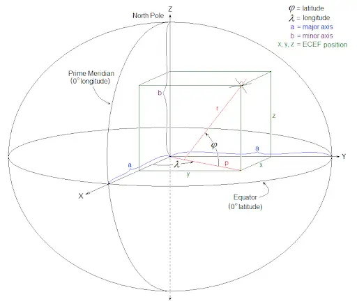 ECEF地心地固坐标系也称为e系,它的原点也是地球的原点, Z轴指向北极, 它与前面的ECI的区别就在于它的XY随着地球的自转而转动,它是以地球为基准的。它的X轴指向格林威治的子午面的交线, Y轴在赤道平面内与X轴、Z轴满足右手系法则,常用的如WGS84坐标系。其特点是与地球固定在一起,随地球一起转动。