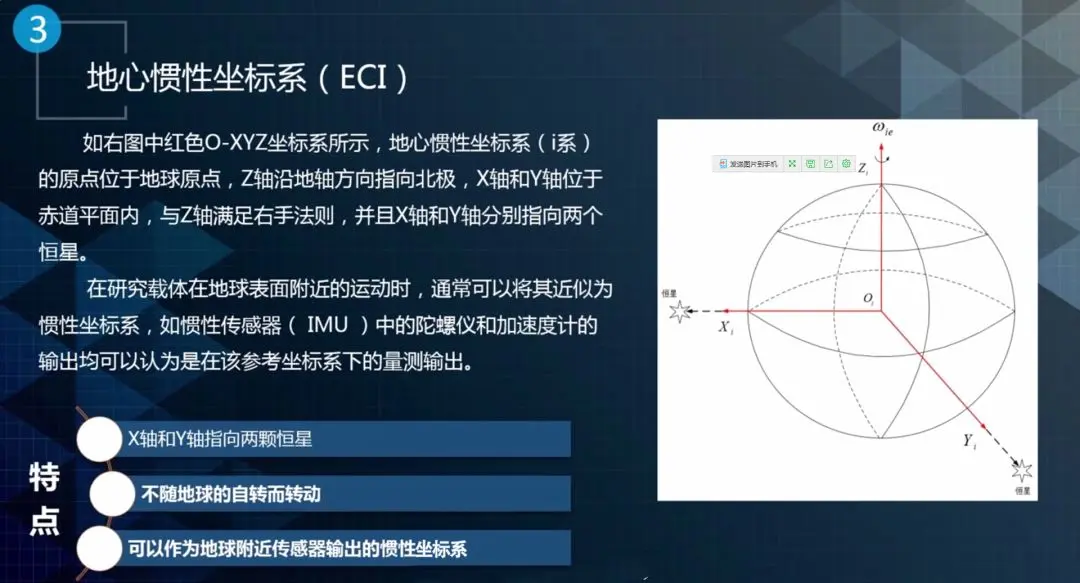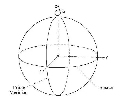 它圆心就是地球的原点,Z轴沿地轴方向朝向北极, X轴和Y轴位于赤道平面内,与Z轴满足右手法则,并且X轴和Y轴分别指向两个恒星。也就是说不随着地球的自转而发生变化。它是一个非常固定的坐标系。IMU测量得到的加速度,角速度都是相对于这个坐标系的。