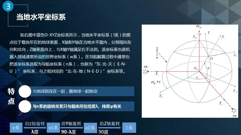 带你更低水平坐标系一般称之为l系,前面讲过地心地固里面涉及到wgs84坐标系,也就是大地坐标系,这个坐标系是常用坐标系,它坐标系用于导航的时候,并没有特别好用,因为是以地心为原点,与平时用的地图不大匹配,所以要引入当地水平坐标系。当地水平坐标系的特点是他的原点一般定义在载体上面,它的朝向xyz经常定义为enu,就是东向北向和天向,相反就是三个轴相反就是北东地,但一般情况下用enu坐标系。这个坐标系在导航中称之为n系,它的特点是原点在载体上面,朝向是enu。并且和地球固链在一起,也随着地球转动。E系的旋转关系,是和当地坐标系所在位置有关,大地坐标系很多时候有xyz表示,也有经纬度表示,经纬度可以一对一转换为xy。