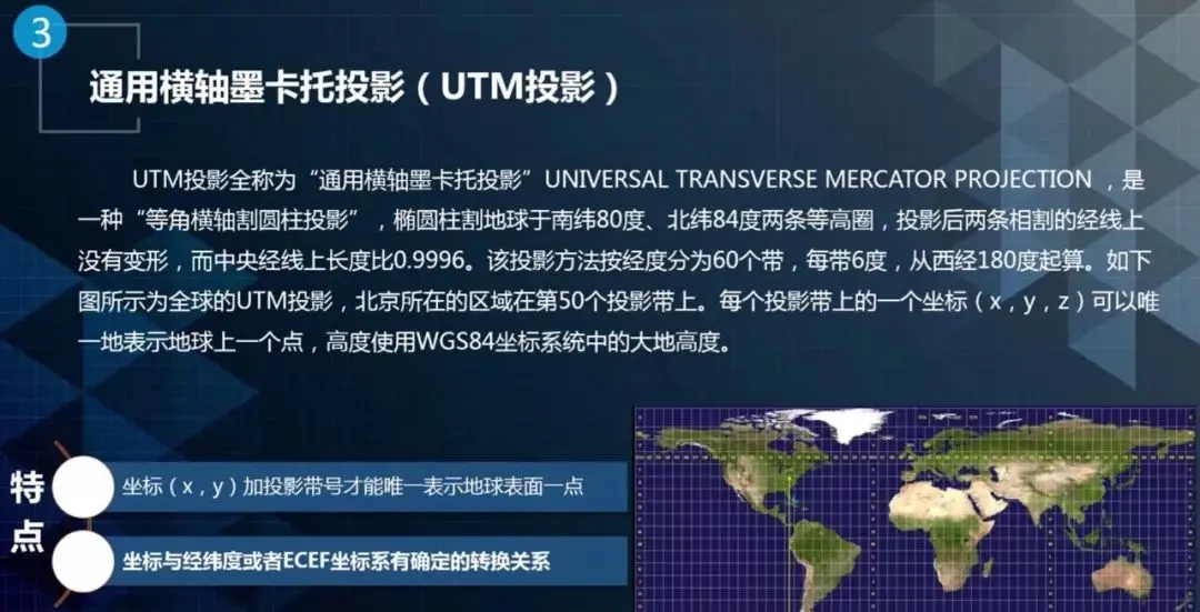 一般情况下只是在一个带里面,比如说6度1个带60个区域,每个区域里面其实都是一起用的,没有在做经纬度的划分,但是在高纬度,因为地球上一个球,到最高纬度的时候,变换(误差)特别大,所以它有个限定,到了北纬(高纬度),用的换算公式不一样,utm坐标系,他就是我们平时定位输出的坐标系,我们用这个坐标系做输出,它的坐标xy,再加上刚才所说的投影带的代号,就是0到59或者1到60,一般情况下1到60,加一个代号,就知道xy坐标,就可以换算成大地坐标系xyz,也换算成经纬度。